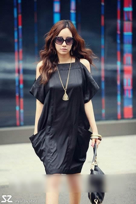 黑色丝质连衣裙,露出美丽的双肩,低调华丽女人风。