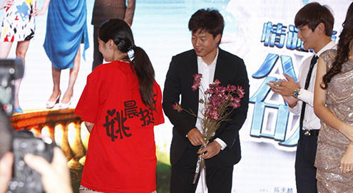 令人诧异的是,发布会最后,主办方邀请五位粉丝上台向凌潇肃送花,热情的粉丝们一拥而上,险些将其推倒。本以为是凌潇肃的粉丝前来应援,却不想粉丝都是清一色的红色会服,背后写着“姚晨挺住”四个大字。不过凌潇肃似乎对这背后的“玄机”全然不知,欣然接受了送花。