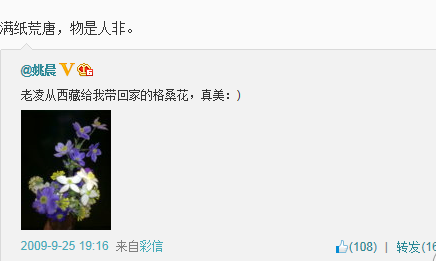 姚晨曾就此事发声,转发2009年凌潇肃送其格桑花的微博,并附文:满纸荒唐,物是人非。此番粉丝给凌潇肃送上格桑花,似乎是用一种独特的方式支持姚晨。