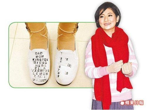 ella的好姐妹selina日前翻出白色功夫鞋,发现鞋面有污垢,发挥创意用防水印泥盖章,加了dad、mom、diong、ella、hebe等亲友代号,ella笑说要弄一双来穿。