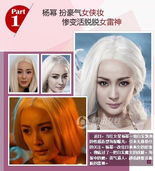 杨幂近日的白发魔女造型尽显妖娆。颠覆了往日柔弱女子的形象,但英式粗眉外加烟熏眼线,突出了整体眼部的立体感,但却忽视了杨幂眼神的呆滞和鼻子以下的妆容修饰。让人不禁遐想起早日火爆播出的《复仇者联盟》中的雷神一角,就算是代言了个游戏的角色吧,但也不必非像英雄们的英姿飒爽靠近吧,这次杨幂颠覆的大发过头了。
