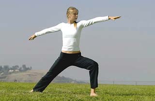 1.双脚张开如腰宽站立,体重摆到右脚上。嘴巴一面吐气,一面抬高右手伸展侧腹,同时收缩左侧腹。感觉上右侧的肋骨和骨盆被拉开,左侧的肋骨和骨盆靠近。伸展左侧时一样。