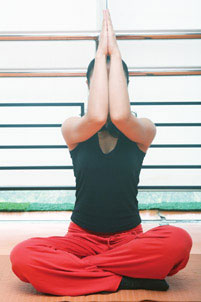 要求:双腿自然盘坐,上体保持直立。双手合十,并把手臂及肘关节一起并拢。当完全并拢后将手指慢慢升高。要注意肘关节始终要保持收紧。保持20-30秒。