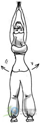 双手合十提高挺直,双腿保持静态,向右弯腰将上半身向左方伸展,维持动作数秒后返回直立姿势。左右方交替重复进行。