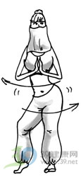 两手张开,呈“8”字形来回摆动腰部,注意不要用背部力量旋转。