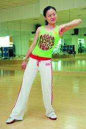 最后一拍左脚向左迈出一步,腰部及肩膀向左拉伸,头部转向右,这一拍的后半拍需要立即把右腿收回,然后把头彻底偏向左侧。