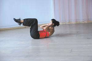 双腿抬起与地面成90度,双手放在耳边,收紧腹部。