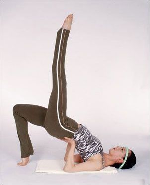 (3) 先吸气,然后呼气,同时左腿向上伸直,保持5-10秒,自然地呼吸。