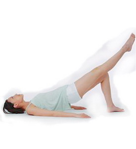 平躺在地上,双腿分开并曲膝,用手臂和脚的力量撑起身体,背部、臀部和大腿离地成一直线。保持姿势,将右小腿向上伸直,再回落换腿。每条腿各重复5次