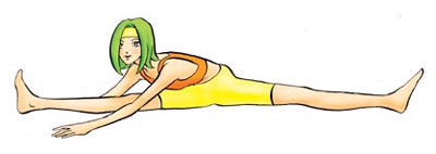 两脚心尽量张开,将上身倾向一边,手往同方之斜上方尽可能伸展。注意脚跟不可离地,左右进行。