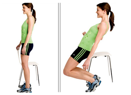 站在一把椅子旁边,双脚朝前,双腿直立,微微分开。一只手扶住椅背,后背尽量后倾,直到膝盖与地面平行(用你的脚尖保持平衡)。恢复到初始状态。加强练习:可以在你的胸部位置穿上5 磅重的沙袋服。