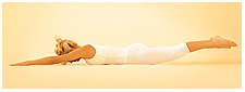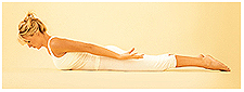 腹部与地面接触趴在地上,双臂放在身体两侧,手掌朝上。把你的前额贴在地上,在你收缩背部肌肉,同时把身体躯干部分抬离地面的时候,保持你的眼睛向下看。从你的头部到你的双手直至你的双脚来伸展你的身体,停止,然后放下来,做6拍。