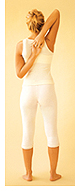 想一些让你觉得高兴的事情,这可以帮助你放松你的肩膀。战例,同时提升你的胸腔,肩膀下沉,后张。把你的右臂伸过头顶,弯曲胳膊肘,用你的右手在身后尽量抓你的左手,可能的话双手抓在一起。如果你觉得你的肩膀太紧张的话,可以拿一个小的毛巾在你的右手中,用它来连接你的双手。在相反的方向伸展你的胳膊肘,均匀的呼吸30秒钟。然后放松,换手臂,然后重复做。