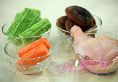 材料:苦瓜、鸡腿、鲜香菇、胡萝卜、盐、蚝油、料酒、胡椒粉。