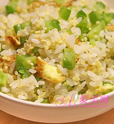 爱美网小编温馨提示:香脆的苦瓜,苦味刚刚好,吃起来带几分香味,跟同样具有减肥效果的玄米饭一起,发挥出清新又健康的减肥功效,帮你排出全身的毒素,丰富的膳食纤维重整肠胃环境,改善易胖体质。