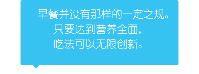 其实,早餐并没有那样的一定之规。只要达到营养全面,吃法可以无限创新。传统认为“适合”做早餐的食物,未必能营养平衡;认为“奇怪”的吃法,也未必营养不平衡。