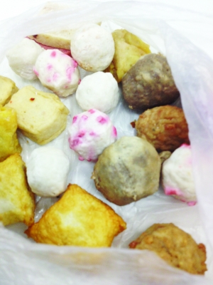 记者看到,在鱼丸前的牌子上,写着“纯鱼肉”等字样,老板娘表示,这些丸子都是自己做的,“肯定真材实料。”但有知情的业内人士告诉记者,实际上市场卖的大多数肉丸,肉的含量很少,消费者也没办法看出来,“主要成分不是肉,是淀粉,加上一些碎肉,然后加上香精和色素。”
