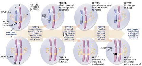 对于男人来说,X染色体上编译大脑结构的基因的任务很简单,因为只有一份基因,只管拿去用就好了。而对于女人来说,她们有两套X染色体,如果两套都用来表达蛋白质,那就乱了套。所以选择用哪一套去编译大脑就成了个难题。在女人的细胞中,两套X染色体会自动有一套失去活性,只留有一套解码编译蛋白质,这种两条X染色体的其中之一失去活性的现象就被称之为X染色体失活。现在普遍认为,在女性胚胎发育时期,大部分情况下,不同细胞中选择哪一套X染色体失活的过程是随机的。导致的结果是,大约一半的胚胎细胞来自于母亲的X染色体失活,而另一半是来自于父亲的X染色体失活。所以基因编译大脑结构的时候,一会儿是来自于母亲的X染色体起作用,一会儿却是来自父亲的起作用,随机选择,没有固定的模式,将X染色体基因表达充分的混合。另外,人的X染色体里还有大约15%的基因是可以逃过失活一劫的,这让本来已经非常复杂的X染色体编译更是变得扑朔迷离。