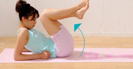 2、然后一边呼气,下巴向下收缩,臀部抬起,双膝弯曲,双腿保持交叉的姿势向上身收回,膝盖尽量向额头靠拢,腹部肌肉收缩并得以刺激。