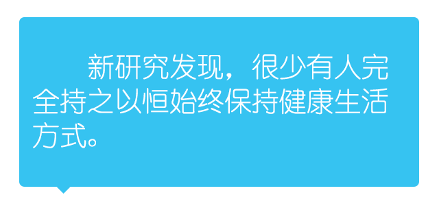 新研究负责人彼得·埃尔伍德教授表示,保持健康生活方式会收到惊人的保健效果,健康行为的受益远远超过医疗等其他预防措施。然而,新研究发现,很少有人完全持之以恒始终保持健康生活方式。在所有人口中,能保持5种健康生活习惯的人只占1%。这一比率30年来几乎没有变化。