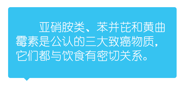 医学研究发现,有10多种化学物质有致癌作用,其中亚硝胺类、苯并芘和黄曲霉素是公认的三大致癌物质,它们都与饮食有密切关系。