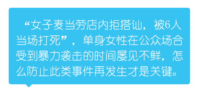 最近新闻"女子麦当劳店内拒搭讪 被6人当场打死"传得沸沸扬扬,但是事实上这个新闻标题起得就不对,去跟死者要号码的是位女性,怎么能算得上搭讪呢?不过单身女性公共场所受到暴力威胁的处事方法确实值得研究。