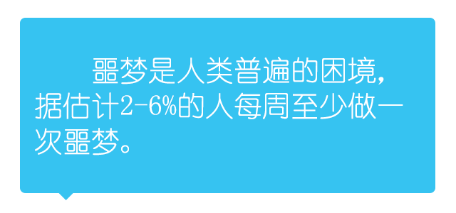 世界很可怕,有时就算睡觉也摆脱不了恐惧。噩梦是人类普遍的困境,据估计2-6%的人每周至少做一次噩梦。蒙特利尔大学梦与噩梦实验室指出青少年是噩梦高发年龄,学前儿童和老年人噩梦较少,女性噩梦要比男性多。虽然做噩梦是非常不爽的,但梦境学家越来越确定噩梦是一种潜意识的情绪规划,在夜晚驱赶你的紧张与惶恐。