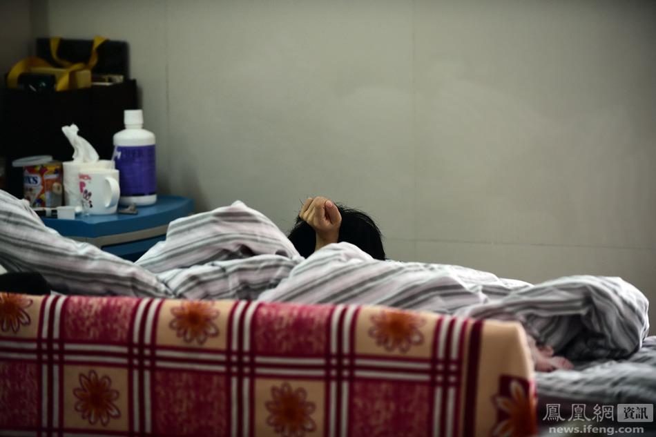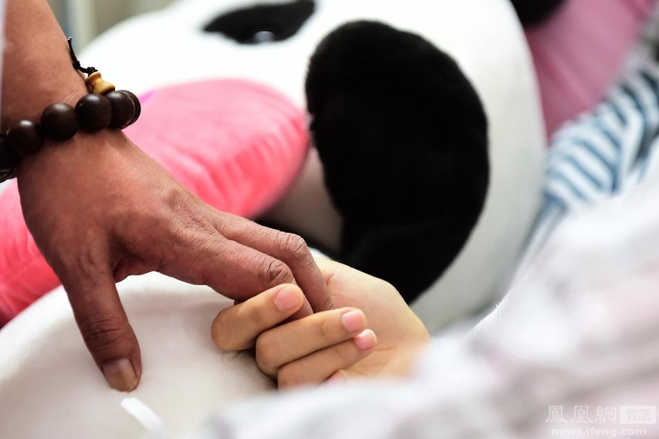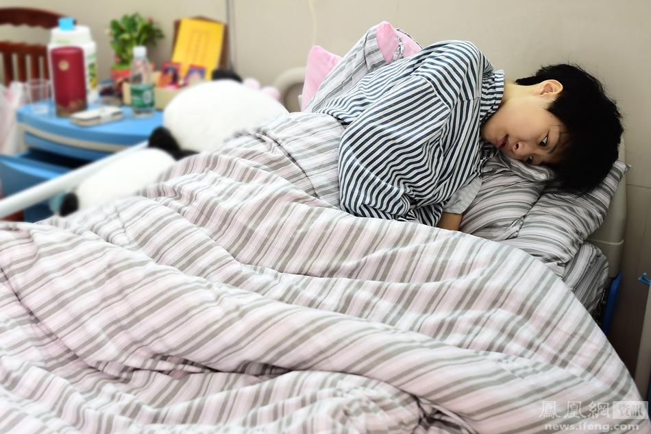 凤仙住院后,在清远开一间五金店的父母不得不放下工作。妈妈一直在医院陪着她,爸爸则清远广州两地跑。她家里还有个弟弟,读高三,准备报考姐姐所在的大学,他说要照顾姐姐。图为妈妈守在凤仙身边。