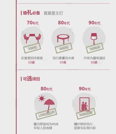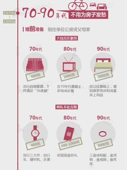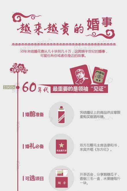 60年代结婚花费几十块,最重要的是互赠毛主席语录,一月工资够娶媳妇。如今结婚花费几十万,最重要的是有房子,七八年工资未必够娶媳妇。来看跨越半世纪的“甜蜜负担。