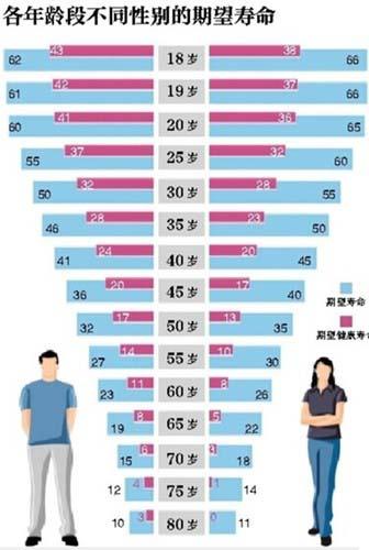 比如,北京市18岁组女性平均期望寿命为66.50剩余年,比18岁同年龄组男性要高4岁多,但其健康期望寿命要低将近5岁。