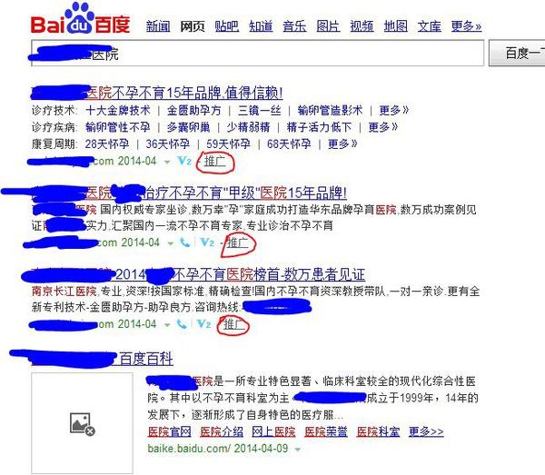 请注意我用红笔圈出来的 推广,这个就代表医院在百度上投入不菲,集中在宣传: