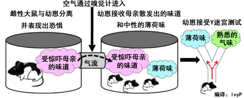 在第一组实验中,研究者们首先让成年雌性大鼠在怀孕前嗅闻薄荷味,嗅闻的同时轻微电击其脚部,以此让它们建立对薄荷味的恐惧。在雌鼠怀孕并产下幼鼠的6到7天后,雌性大鼠被分为两组:第1组在幼鼠面前再次闻到薄荷味,产生恐惧情绪;第2组则没有闻到薄荷味。另外还有第3组大鼠,它们在怀孕前闻到过薄荷味,但没有受到电击。第3组雌鼠在幼鼠面前也会再次闻到薄荷味。7天后,研究者们使用Y 迷宫(Y-maze)对这几组幼鼠进行了有关薄荷味的记忆测试。结果显示第1组幼鼠对薄荷味的回避率最高,并且这种对薄荷味的恐惧一直持续到了幼鼠43天龄(青少年时期)时。这说明幼鼠可以通过接触对某种刺激物产生恐惧的母亲,产生同样的恐惧情绪。