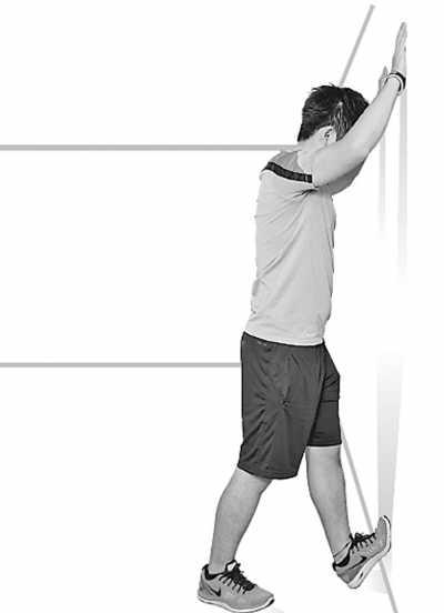动作三:扶墙压脚尖。举起双手,上臂与肩膀在同一水平线上,手掌紧贴墙上;双脚成弓箭步,左腿在前屈膝,脚跟着地,脚尖搭在墙上,右腿在后伸直(如图3);身体尽量贴向墙壁,直至右小腿有轻微拉扯感。▲