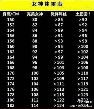 近日一张“女神体重表”在微博上盛传,根据女性身高、体重分为三个等级——“完美女神”、“微胖屌丝”(又称微胖女神)、“土肥圆”。各位姐妹们请对号入座,看看自己与女神的距离究竟有多远。