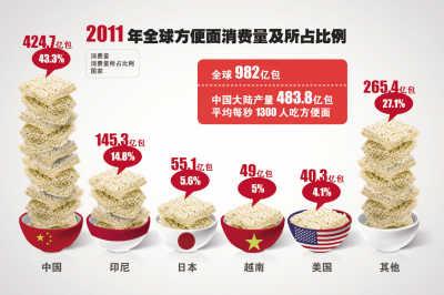 谈起人们对方便面的喜爱程度,以下数据足以说明问题。来自世界方便面协会的数据显示,2011年,全球消费方便面982亿包。其中,中国消费424.7亿包,占全球43.2%,排名第一,印度尼西亚以145.3亿包排在第二,日本消耗55.1亿包排在第三。之后是越南(49亿)、美国(40.3亿)和韩国(35.9亿)。2012年,全球方便面消费量比2011年增加了2.7%,达到1014亿包,首次突破1000亿包,相当于60亿人每人每月至少吃一次方便面。中国(440亿)、印度尼西亚(141亿)和日本(54亿)的消费量依然排在前三。