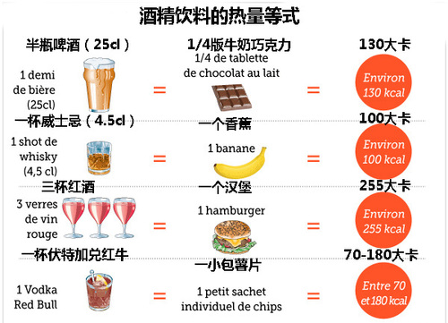 在法国,国家健康营养协会(PNNS)网站并没有揭示酒精对健康及对体重的影响。但它指出,“女性每天喝超过2杯葡萄酒(或一大瓶啤酒,或6cl烈酒),男性每天喝超过3杯,酒精会增加罹患某些癌症的风险(特别是肝癌、消化道癌症和乳腺癌),以及患肝硬化和心血管疾病的风险。啤酒、葡萄酒、烈酒、预调酒饮料……一切都会!”
