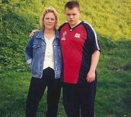 Thompson已经1年没有离开过家门了,本来有妈妈照顾他,当时他400多斤。妈妈2012年癌症去世后,Thompson因为难过,更加无节制的暴饮暴食,体重飙升到800多斤,没法走路,也没法洗澡。图为青少年时期的Thompson和妈妈。