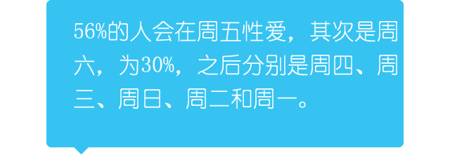 1、周五性爱的人最多,周一是性行为低发时段。该数据来自《玩转东京》的2011年性调查。该调查涉及东京男女性生活的时间段、地点、频率,以及性伙伴的身份。结果发现,56%的人会在周五性爱,其次是周六,为30%,之后分别是周四、周三、周日、周二和周一。