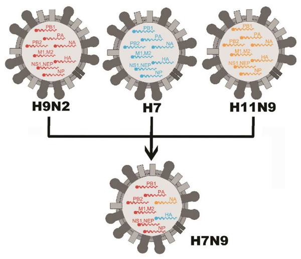 禽流感病毒属正粘病毒科甲型流感病毒属。禽甲型流感病毒颗粒呈多形性,其中球形直径80~120nm,有囊膜。基因组为分节段单股负链RNA。依据其外膜血凝素(H)和神经氨酸酶(N)蛋白抗原性不同,目前可分为16个H亚型(H1~H16)和9个N亚型(N1~N9)。禽甲型流感病毒除感染禽外,还可感染人、猪、马、水貂和海洋哺乳动物。可感染人的禽流感病毒亚型为H5N1、H9N2、H7N7、H7N2、H7N3,此次报道的为人感染H7N9禽流感病毒。该病毒为新型重配病毒,其内部基因来自于H9N2禽流感病毒。