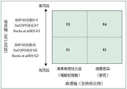 上图的临床轴提供了有关 COPD 急性加重治疗深度和最佳治疗组合的相关信息,两个轴联合应用能够指导治疗方案的制定。E1 中的 COPD 急性加重患者(嗜酸粒细胞炎症,低风险)可给予口服(或高剂量吸入)糖皮质激素治疗;处于 E2 的 COPD 急性加重患者(细菌感染,低风险)可给予口服抗生素治疗;而处于 E3(嗜酸粒细胞炎症,高风险)或 E4(细菌感染,高风险)的患者,则需要住院(普通病房或 ICU),分别接受全身糖皮质激素或抗生素治疗。