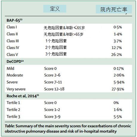最后,Roche 等提出了基于年龄、呼吸困难、多种临床体征(包括紫绀、吸气时动用辅助呼吸肌,胸腹矛盾运动、扑翼样震颤、神经系统损害和下肢水肿)的 COPD 急性加重的死亡风险积分,可将 COPD 急性加重分为不同的三种类型。