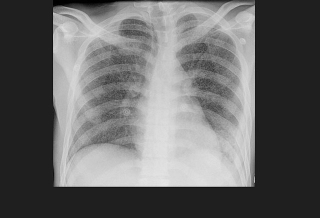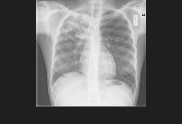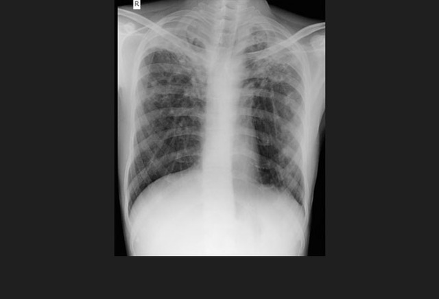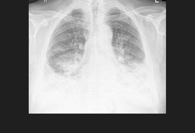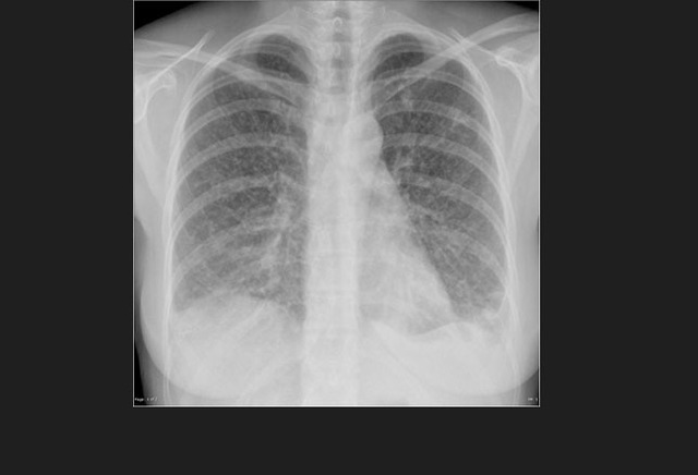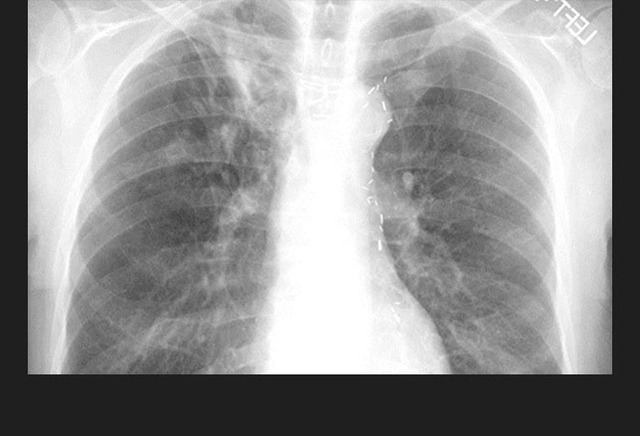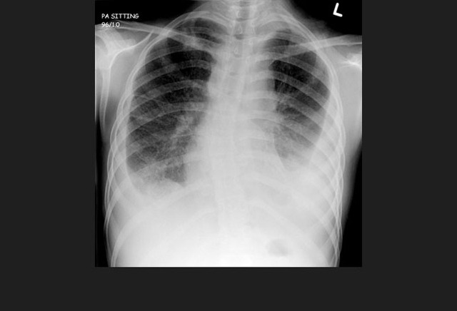 图1. 一位进展性肺结核患者双侧胸腔积液(左侧较右侧严重)。