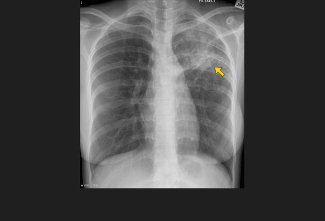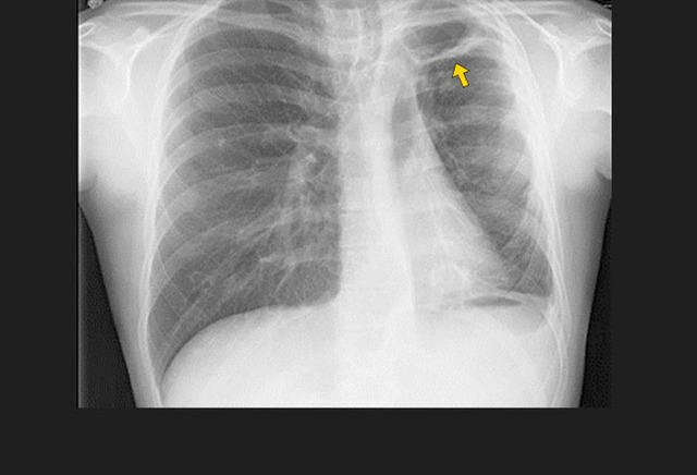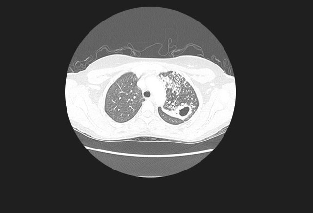 图11. 左上肺斑片状实变影,随后患者被诊断为结核