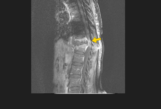图6. 增强T1加权的磁共振矢状面图像展示了波特病的椎体受累表现