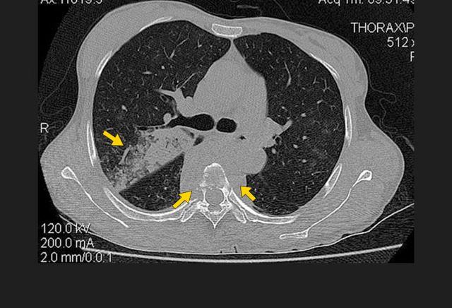 图13. 轴面骨窗CT展示了一位肺结核及波特病患者右上叶后部实变,椎旁软组织增厚及临近椎体的破坏。