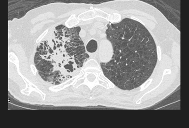 图9. 冠状位CT展示了一位结核患者右上肺的巨大空洞病变,伴随着多个小结节及空洞。